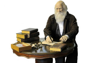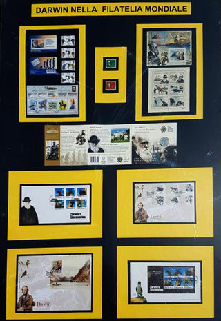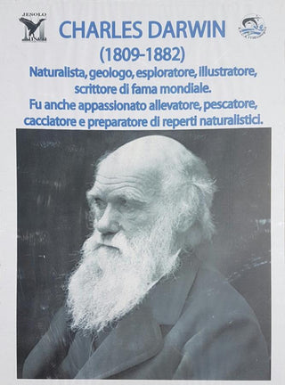 Questa mostra è nata in occasione del bicentenario della nascita di Charles Darwin e ha il prioritario scopo di ricordare la memoria e l’operato di questo grande eclettico naturalista inglese. Fu ideatore e membro di importanti spedizioni scientifiche, la più nota è quella delle Isole Galapagos. Si dimostrò uomo di scienza e di grandi capacità intuitive, si distinse come geologo, ornitologo, erpetologo, botanico ed entomologo. Sappiamo che fu anche abile preparatore tassidermista. Il British Museum di Londra conserva molto materiale da egli stesso raccolto e preparato. Fu autore di molti testi, ma il più importante rimane sicuramente “On The Origin of Species” pubblicato a Londra nel 1859 e tradotto in svariate lingue. Le teorie sull’evoluzione della specie contenute in questa sua monumentale e innovativa opera divennero ben presto oggetto di animate discussioni e critiche da parte del mondo scientifico più conservatore, anche i movimenti di pensiero religioso guardarono con sospetto le teorie da lui avanzate. Oggi possiamo tranquillamente affermare che fu il precursore di tutta una serie di scoperte e deduzioni scientifiche da ritenersi fondate e valide. La mostra è riuscita a raccogliere ed esporre rare prime edizioni in lingua italiana e straniera inerenti i suoi studi più importanti e bibliografie sulla sua vita, unitamente a una singolare collezione filatelica–numismatica commemorativa, ma ciò che maggiormente impressiona è la fedele riproduzione a grandezza naturale di Charles Darwin che si presenta seduto al suo tavolo di lavoro intento ad esaminare testi e pelli di uccelli. E’ stato raffigurato quando aveva raggiunto i settant'anni d’età, è vestito con abiti d'epoca di fattura inglese. La mostra vede poi la ricostruzione, sempre a grandezza naturale, di alcuni animali che lui ha studiato ed esaminato con maggiore attenzione: due tartarughe giganti delle Galapagos (Chelonoidis nigra) create per essere toccate e cavalcate dai bambini; un esemplare adulto di dodo (Raphus cucullatus) estintosi nel 1680 nelle Isole Mauritius e un adulto di alca impenne (Pinguinus impennis), specie che sappiamo egli studiò con attenzione proprio per la loro singolare struttura. La mostra è anche corredata da numerosi poster descrittivi 70 x 100 cm incorniciati a giorno in plexiglass, che possono essere esposti su apposite griglie metalliche, nel rispetto di tutte le normative vigenti antinfortunistiche. Da non sottovalutare è la serie di crani in calco o originali inerenti le diverse fasi evolutive degli ominidi che furono al centro dei suoi più impegnativi studi e teorie. Inoltre è possibile esporre due sue originali preparazioni tassidermiche in pelle relative a due specie ornitiche.